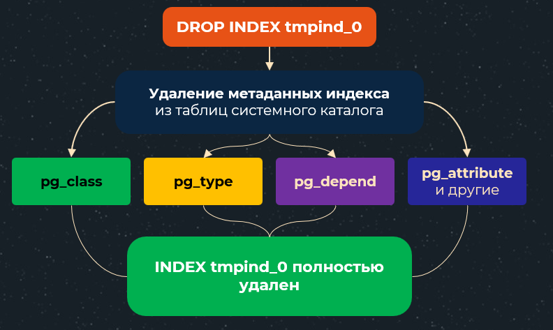 Вторая проблема была связана с долгим удалением индексов временных таблиц. Чтобы удалить индекс, необходимо также очистить из таблиц системного каталога информацию о нем, например: