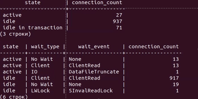 Верхняя таблица отображает количество соединений в разрезе состояний (active, idle, idle in transaction), а нижняя дополнительно в разрезе типа и события ожиданий.