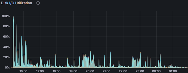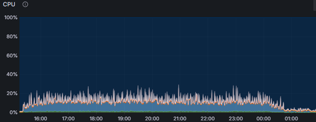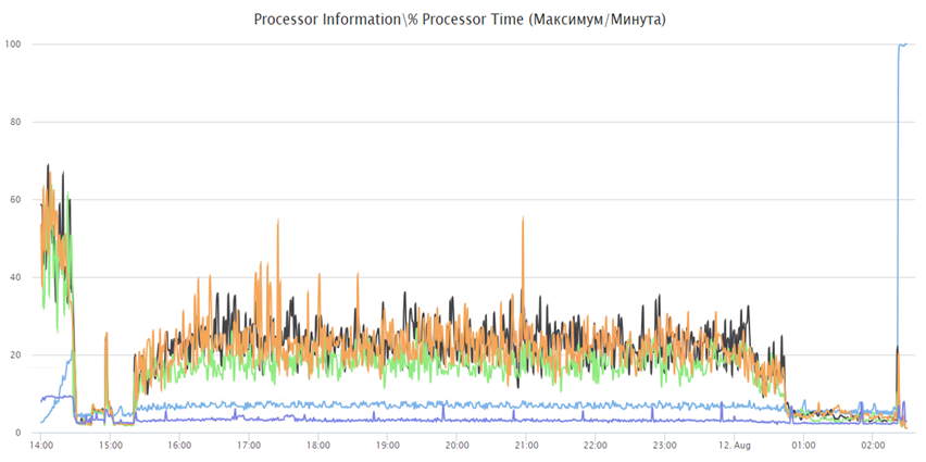 В ходе выполнения теста средняя загрузка процессора на сервере СУБД не превышала 30–40%, на серверах приложений оставалась ниже 40%. Дисковая подсистема показала время отклика при чтении порядка одной–двух миллисекунд, при записи - около пяти миллисекунд. Длительность теста составила 11 часов непрерывной работы, и за это время не было зафиксировано падений процессов, критических ошибок или блокировок.