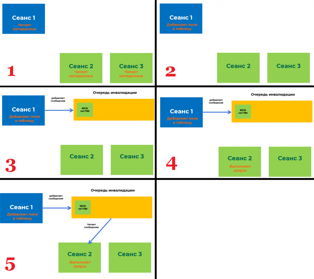 5. Сеанс 2 делает запрос в очередь инвалидации по списку таблиц, которые он использует, чтобы запросить информацию по этим таблицам. И получает из этой очереди сообщение, что добавилось новое поле в таблицу, и обновляет у себя в локальном кэше данную информацию. Теперь он может выполнить запрос к базе данных и не получить ошибку, что данная колонка не существует.