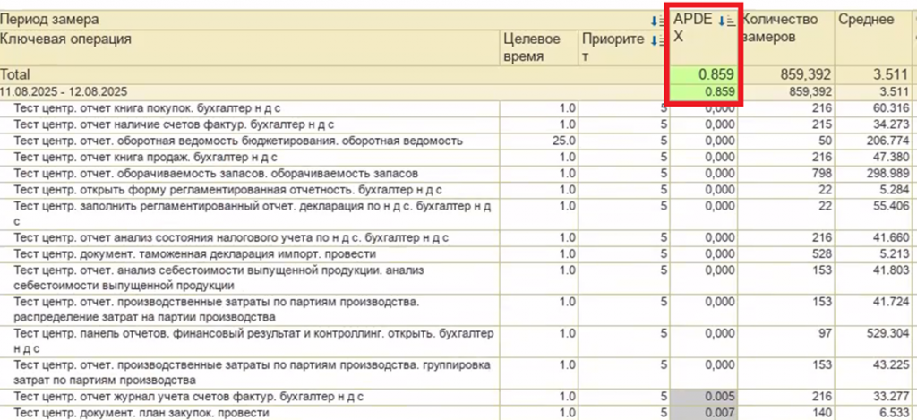 Наш самый успешный прогон показал результат APDEX 0.859:
