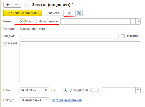 Важно: Для удобства к задаче можно прикрепить файлы (договоры, акты, таблицы) через значок "скрепка". Это избавит от поиска документов в других папках.