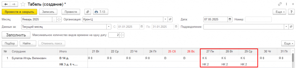 Шаг 4. Ввод часов НК в табель