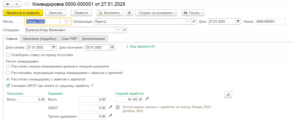 Рис. 1 Оформление командировки в базе 1С: ЗУП
