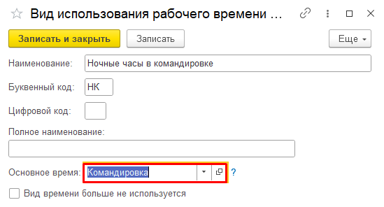 После настройки вида времени необходимо создать соответствующее начисление для доплаты за ночные часы в командировке. Это начисление должно отличаться от типового начисления: