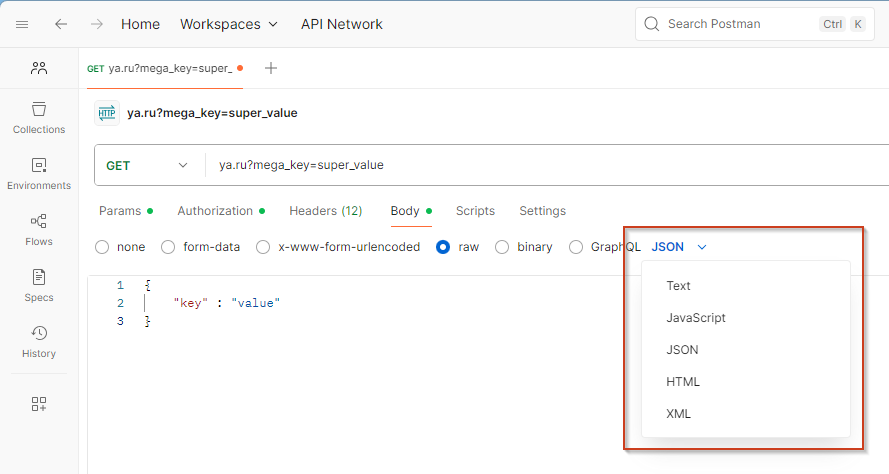 На закладке Body настраиваем тело POST-запросов – что именно мы отправляем. Можно выбрать нужный content-type и задать поля через интерфейс.