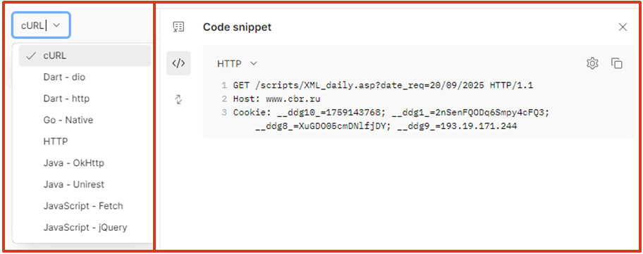 Например, можно на основе запроса сгенерировать код для других языков программирования. В моей практике это чаще всего Python, либо утилита CURL для Unix-систем. Также бывает полезно посмотреть server-http-запрос, чтобы понимать, что именно и куда отправляется.