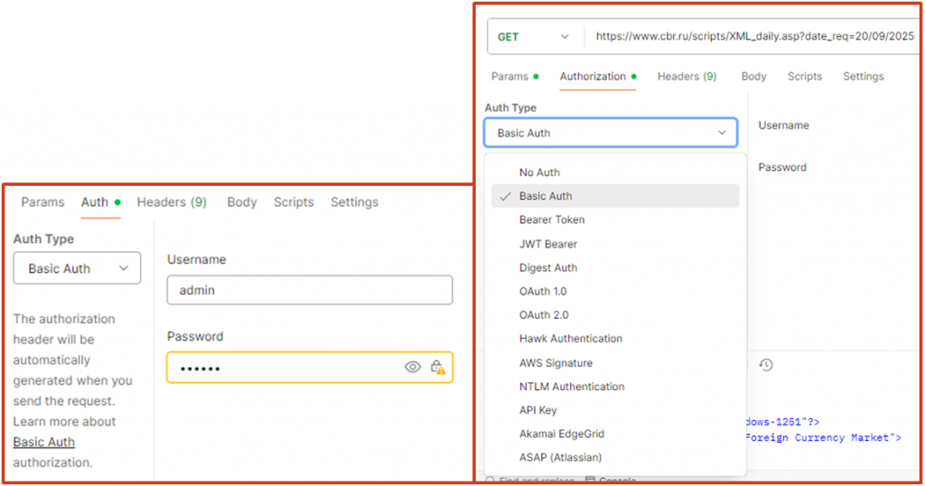На закладке Authorization представлены основные типы, через которые мы можем пройти авторизацию: базовый логин и пароль, токен и другие варианты.