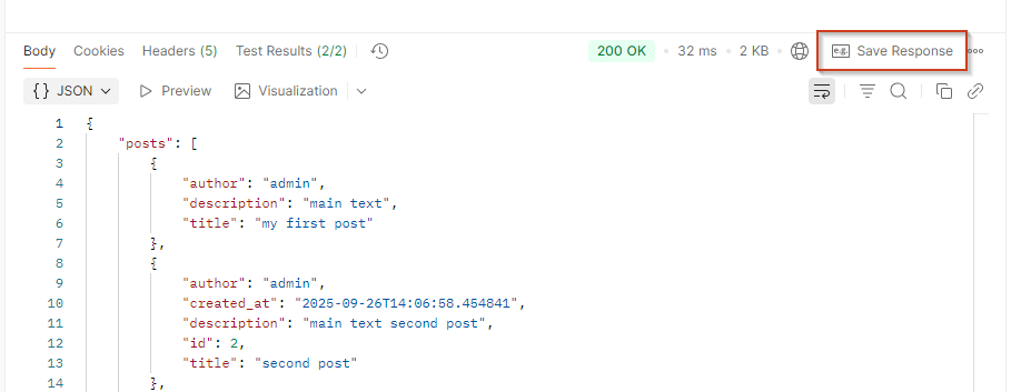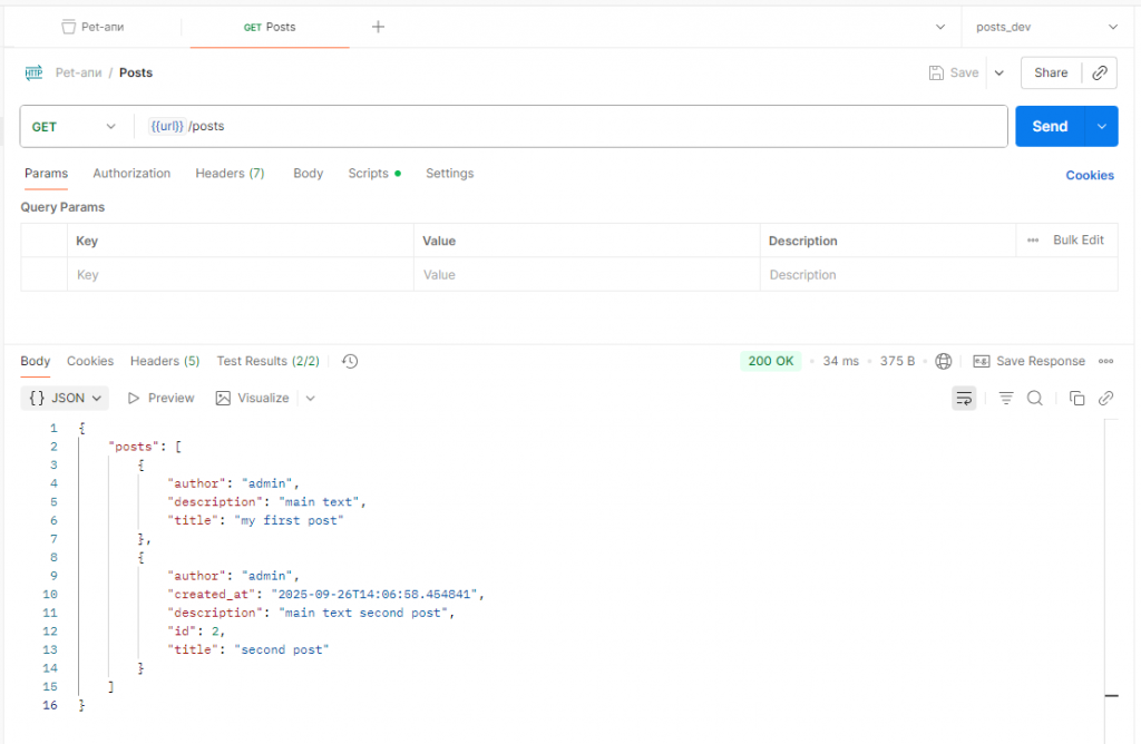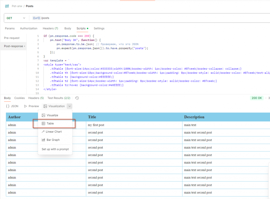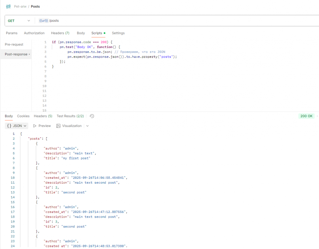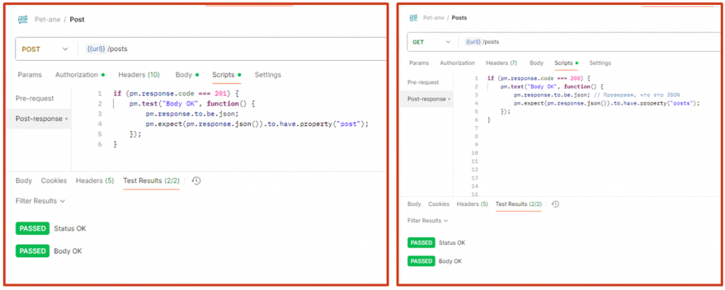 Мы можем анализировать не только статус запроса, но и данные, которые он возвращает. Здесь два небольших примера. В первом запросе мы записываем в базу данных новый пост, и нам нужно проанализировать, что вернулось, потому что мы ожидаем определенные свойства. Здесь мы это и описываем – буквально в шесть строк кода. На правом изображении мы получаем список постов и ожидаем, что в ответе будет массив с нашими записями. Если выполнить эти запросы, на закладке Test Results в нижней части интерфейса появятся два пройденных теста. Со статусом Ok – тест, который мы описали в коллекции. Второй тест относится к конкретному запросу.