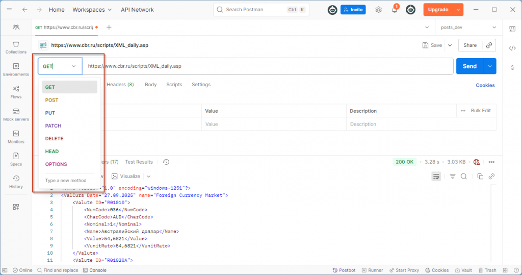 Коротко пройдемся по тому, что можно делать с запросом. Мы выбираем тип запроса: чаще всего это GET или POST, но доступны и другие типы.