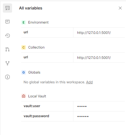 Помимо коллекции, переменные могут храниться в окружении – об этом я расскажу позже. Они могут быть глобальными для всех запросов внутри Postman, а для отдельной конфиденциальной информации можно создать локальное шифрованное хранилище и хранить логины и пароли там. В последней версии Postman во всех местах, где можно хранить переменные, кроме коллекции, их можно сделать секретными, то есть при экспорте коллекции их значение выгружаться не будет. Похоже на небольшой баг, думаю, его скоро исправят.