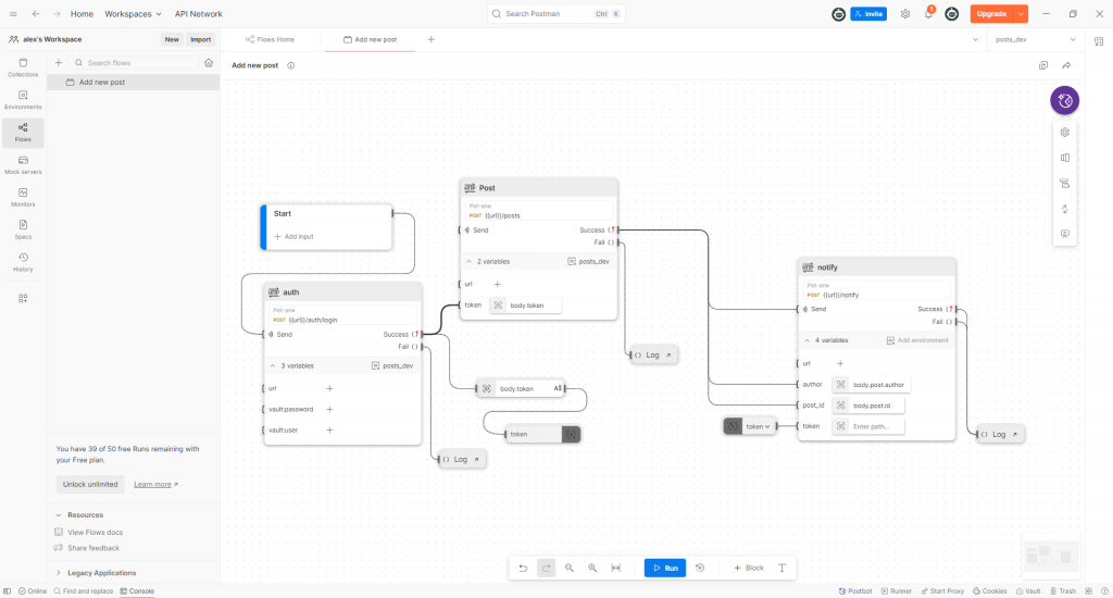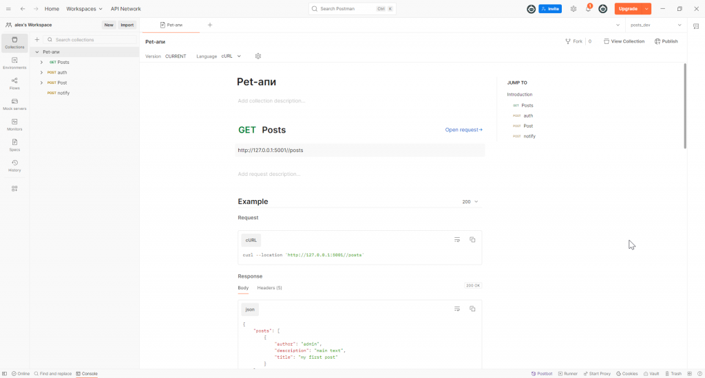 Как я уже объяснил, для того, чтобы создать новую запись, нам сначала нужно пройти авторизацию, получить токен, создать новый пост, а после этого может улететь какое-то оповещение. Данную информацию можно передать в виде документации, записав голосовое коллеге или описав кодом. Все эти инструменты и шаги имеют право на существование, но Postman решил пойти дальше и добавить интерактивность.