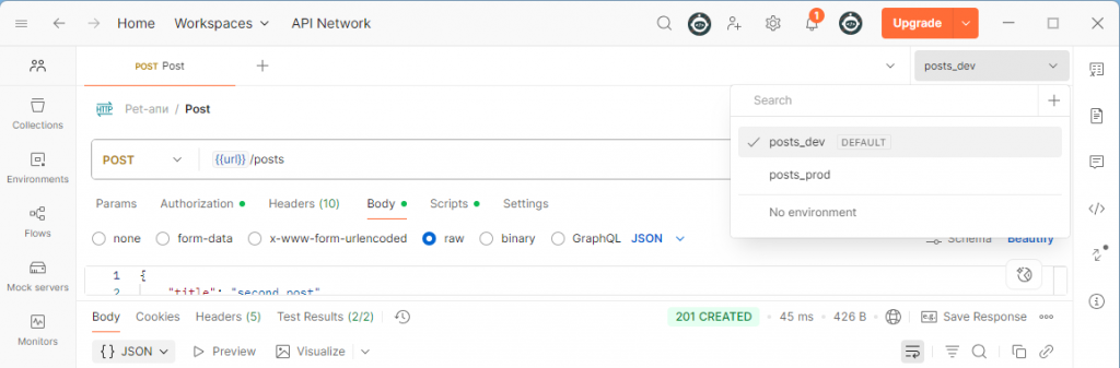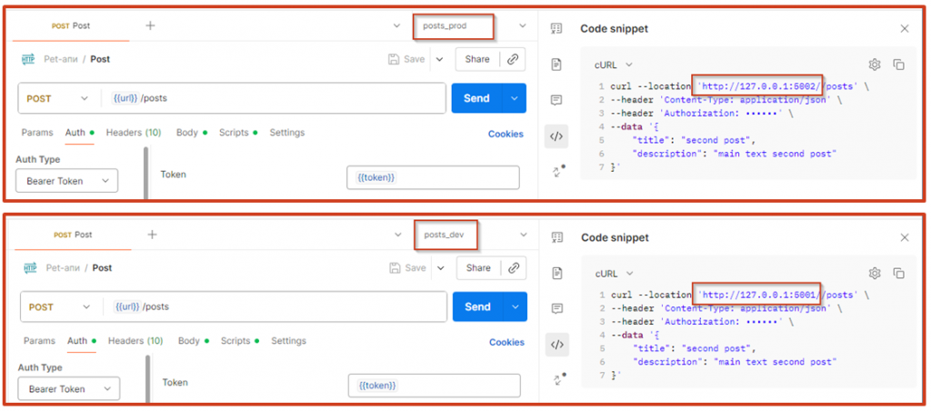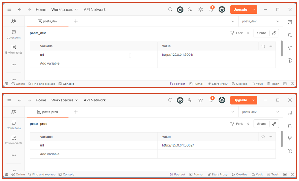 Вынесем параметр URL в созданные нами окружения post-dev и post-prod. Помимо адреса сюда можно выносить любые другие параметры. В окружениях переменные можно делать секретными, шарить их и так далее.