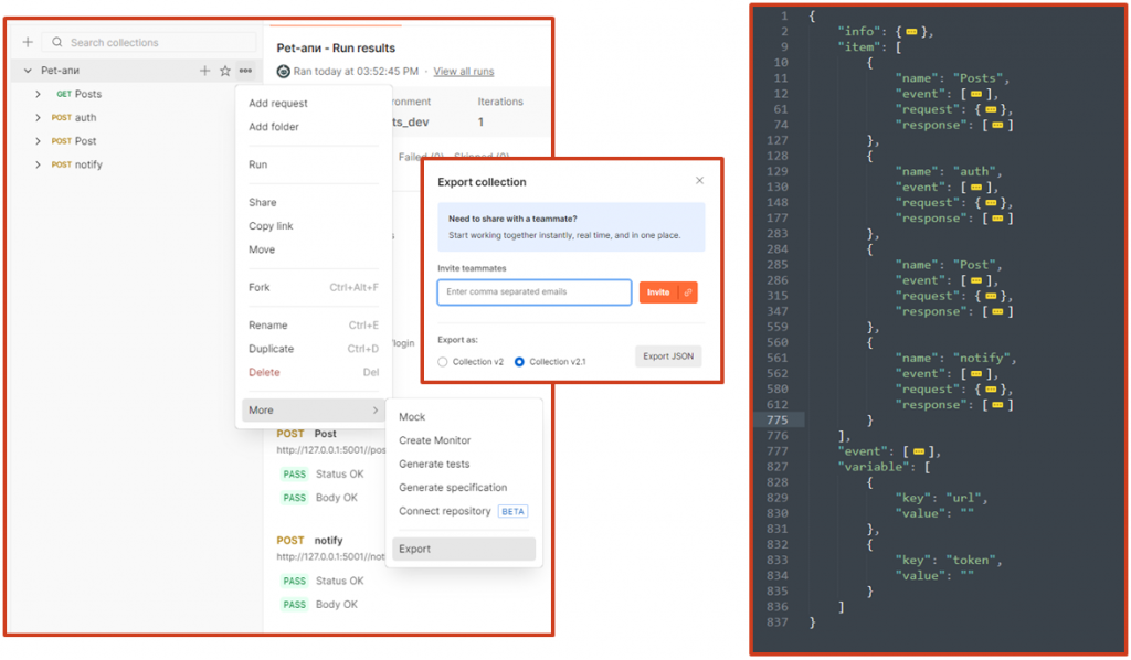 Но это еще не все. Мы можем выгрузить коллекцию в файл JSON и с помощью инструмента под названием newman, который устанавливается через пакетный менеджер npm, запускать наши тесты из консоли.