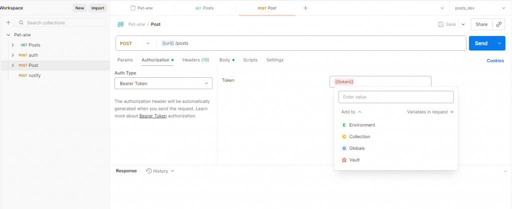 Для того, чтобы написать новую статью, то есть выполнить POST-запрос, нам нужно получить токен. Поэтому создадим эту переменную, но значение заполнять не будем, так как токен будет получаться динамически.