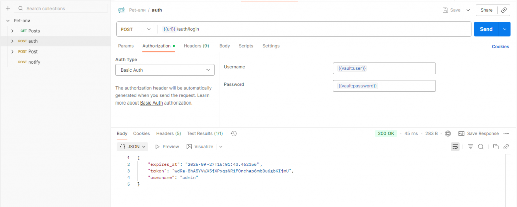 Рассмотрим, как это происходит. Вот небольшой POST-запрос, в котором мы используем переменные user и password, хранящиеся в локальном хранилище. Для обращения к ним нужно использовать ключевое слово vault и двоеточие. Результатом запроса будет JSON-объект, в котором лежит наш токен.