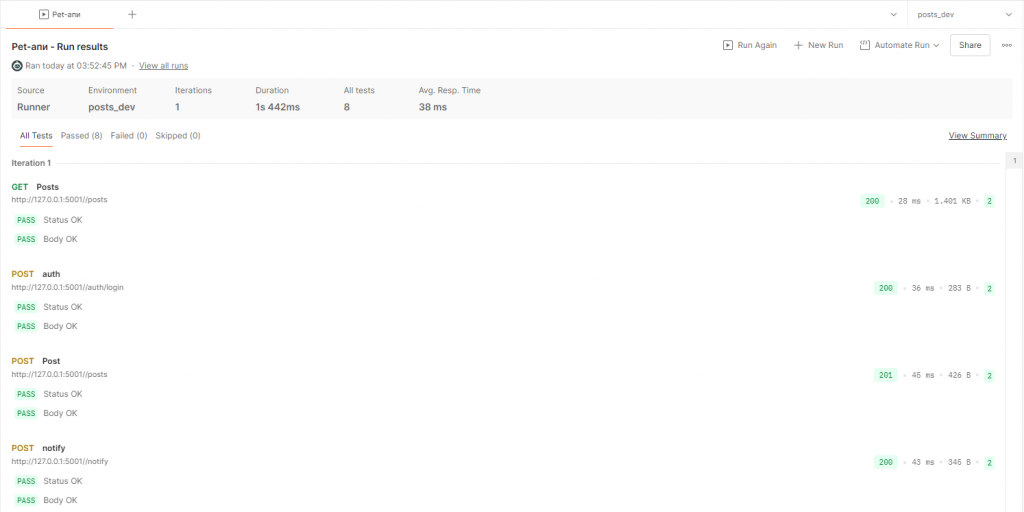 Результат выполнения тестов для коллекции выглядит так: видно, сколько запросов выполнялось, какие статусы они вернули, какие тесты упали, какие прошли, и все это можно выгрузить в JSON для дальнейшего анализа.