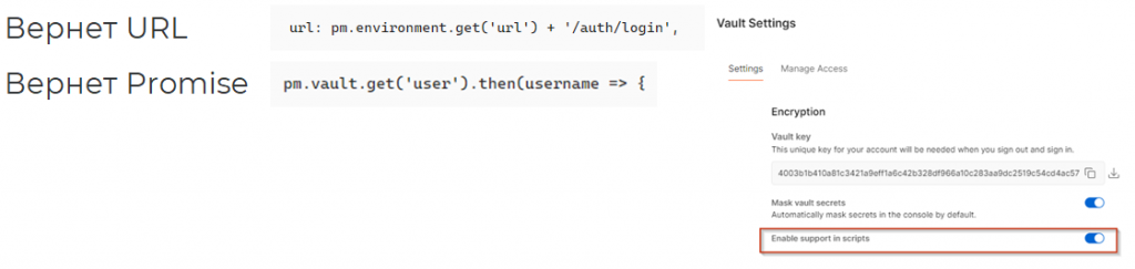 К переменным можно обращаться внутри скриптов. Здесь есть нюансы. При обращении к переменным окружения, коллекции и глобальным переменным через метод get(имя переменной) мы сразу получим значение. Но если использовать значение из локального хранилища, нужно сначала разрешить работу с ним в настройках. Далее, при вызове метода get во второй строке мы получим не значение, а promise – обещание. Это асинхронная технология JavaScript. В целом она несложная, просто код будет выглядеть иначе.