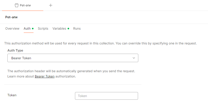 Казалось бы, можно выполнить запрос вручную, скопировать токен, зайти в коллекцию и заменить его. Но даже описывать это неудобно, а делать каждый раз руками тем более. Поэтому предлагаю начать автоматизацию и вынести эту операцию в скрипты. Вынести ее можно как в отдельный запрос, так и на уровень коллекции целиком.