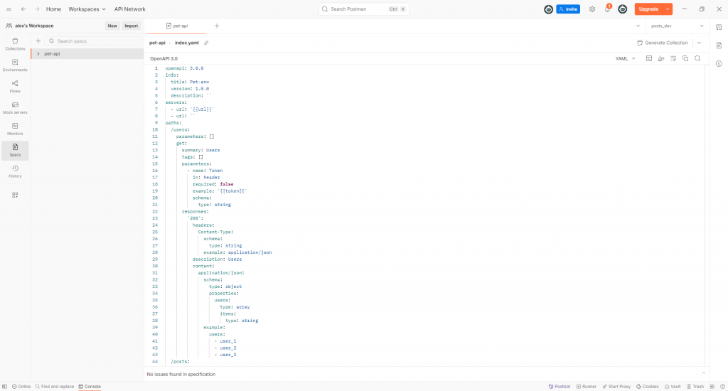 После всех манипуляций мы можем сгенерировать для коллекции документацию в Postman. Она называется спецификацией и формируется в формате OpenAPI.
