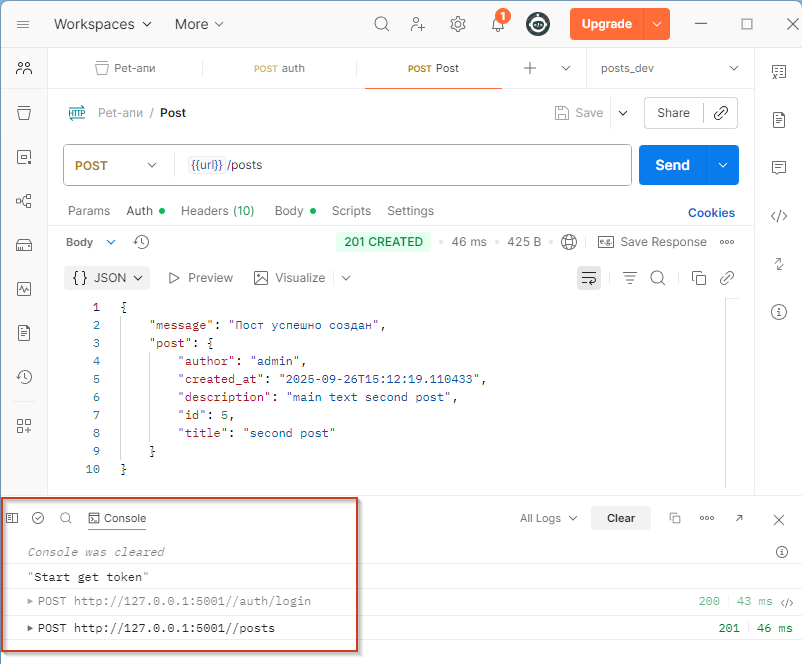 Как это проверить? Переходим в один из запросов, отправляем его, открываем консоль в левом нижнем углу и смотрим результат. Код выполнился, мы сходили на endpoint-логин, получили новый токен и только после этого с успехом выполнили запрос.