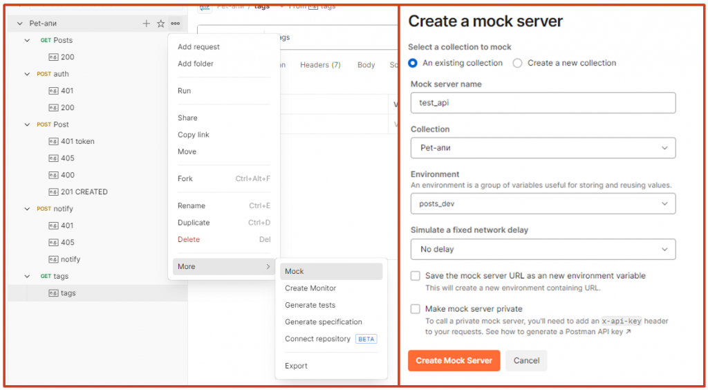 Теперь в коллекции буквально в два клика можно создать mock-сервер.
