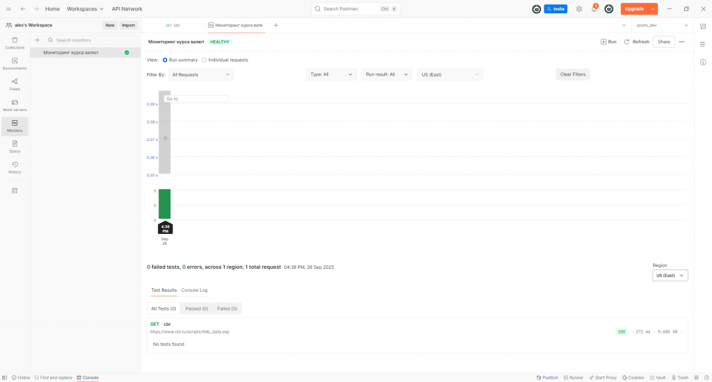 Для этого на закладке Monitors, расположенной слева, создаем новый монитор, выбираем расписание, как часто его выполнять, и указываем почту, на которую будут приходить алармы. Для примера я на своем ноутбуке сделал вид, что написал сервис с курсами валют от ЦБ РФ, записал запрос, настроил монитор и получил такие результаты выполнения.