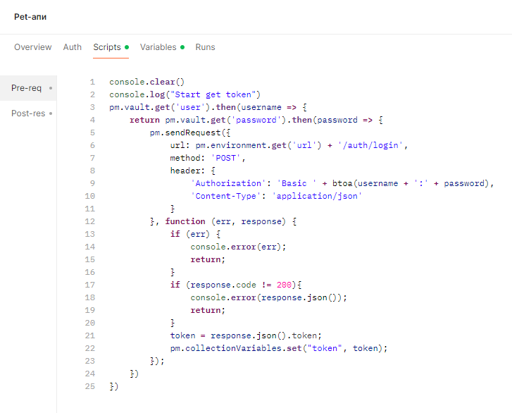 В первых двух строках мы очищаем консоль и выводим стартовое сообщение. В третьей и четвертой строках мы обращаемся к нашему хранилищу для получения значений user и password. Это как раз тот случай, о котором я упоминал выше: promise и работа с ними. Это один из вариантов обращения. В пятой строке мы описываем сам запрос с его URL и авторизацией. Далее обрабатываем ошибки, проверяем статус, и в 21–22 строках парсим тело ответа, извлекаем токен и помещаем его в переменные коллекции. Теперь этот запрос будет выполняться перед запуском всех дочерних элементов коллекции.