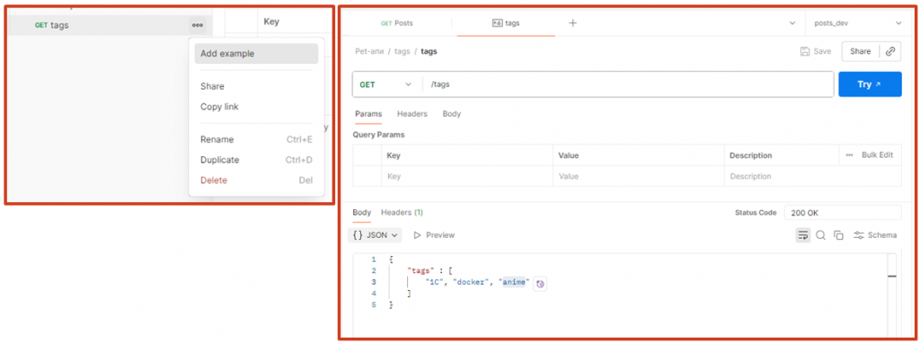 Допустим, нам нужен endpoint, который при обращении будет возвращать список всех тегов, связанных с нашими постами. Для этого создаем новый запрос. Полный URL прописывать не нужно – достаточно добавить последнюю часть пути, к которой будет выполняться обращение. Затем создаем один экземпляр ответа. В нем описываем, что именно нужно возвращать: на закладке Body выбираем нужный content-type, указываем статус 200 и сохраняем.