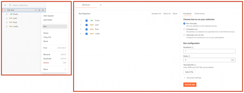 За кадром мы описываем тесты для всех остальных запросов. Теперь мы можем запускать их пачкой, а не выполнять каждый по отдельности. Это одна из возможностей коллекций. Мы можем менять запросы местами, отключать ненужные, зацикливать их, запускать по расписанию, а для нагрузочного тестирования – запускать в несколько потоков. Очень удобный инструмент.