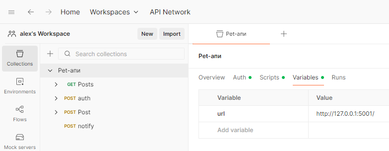 Так как все запросы относятся к одному API, логично вынести переменную URL в переменные коллекции.