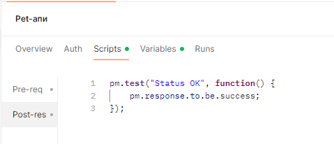 На закладке Scripts мы на языке JavaScript можем описать, что нужно выполнить перед запросом и после него. На данном изображении для примера приведен небольшой тест, который после выполнения запроса проверяет, что все прошло успешно. Этот тест будет выполняться для всех дочерних запросов.
