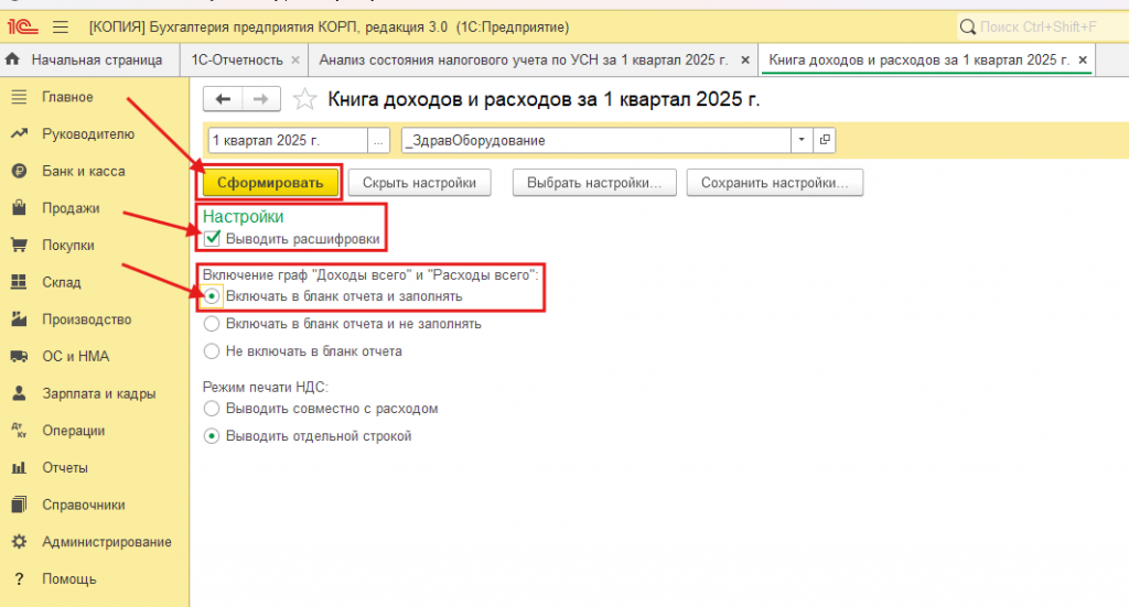 «Книга учета доходов и расходов» заполняется автоматически по данным налогового учета за любой отчетный период (квартал, полугодие, девять месяцев, год).