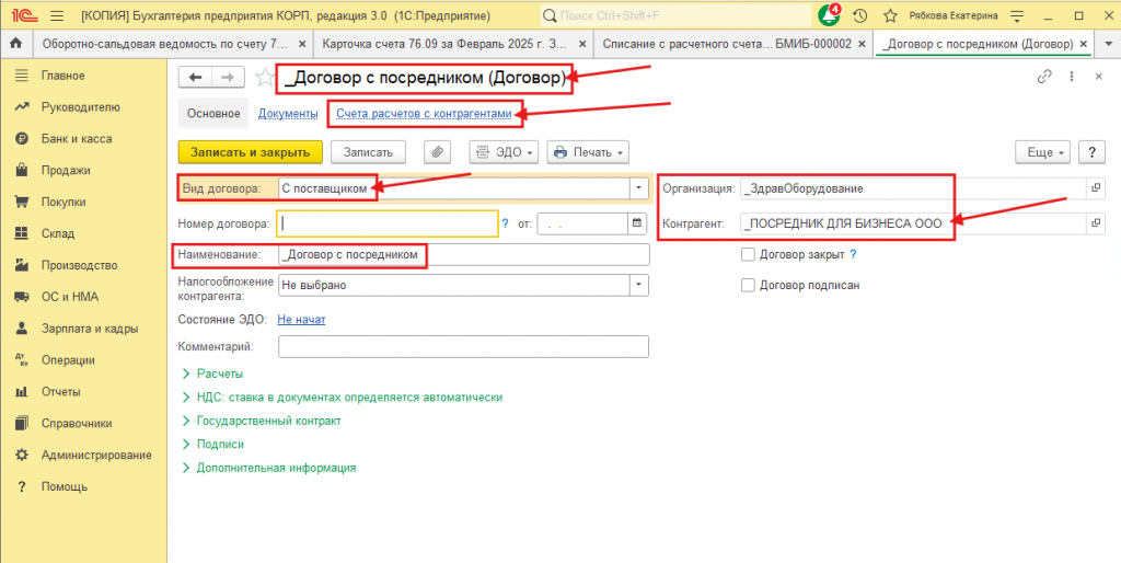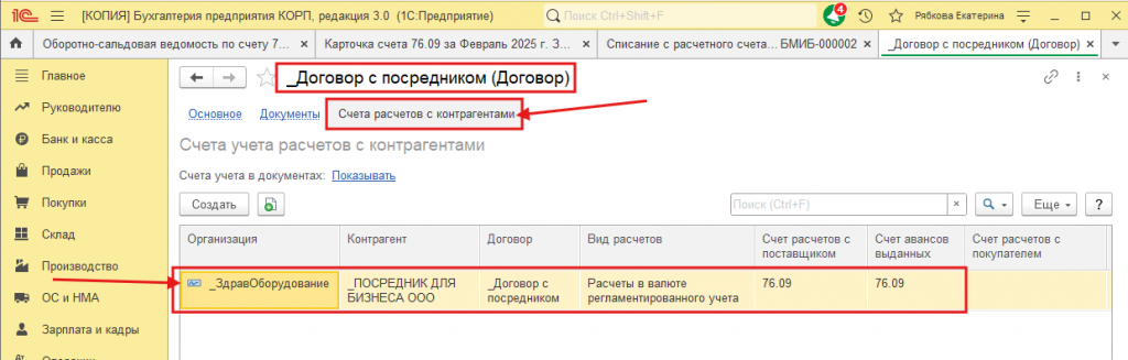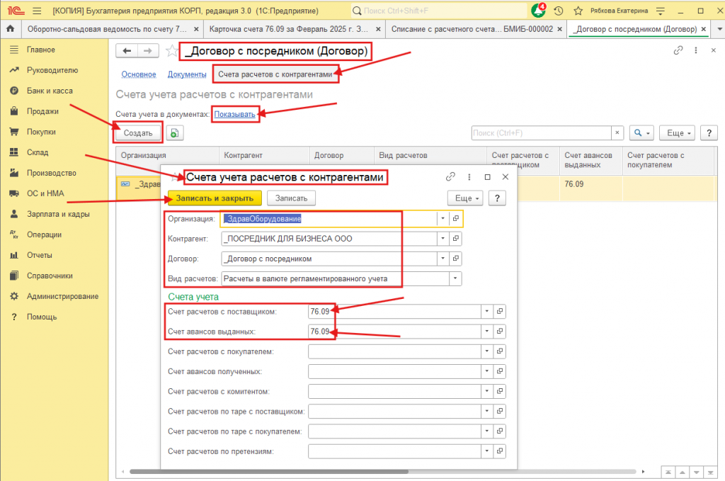 Для того, чтобы после проведения документа «Списание с расчетного счета» с видом операции «Оплата поставщику», сформировалась проводка в корреспонденции именно с субсчетом 76.09 «Прочие расчеты с разными дебиторами и кредиторами», нужно провести соответствующие настройки в карточке договора с Агентом пройдя по гиперссылке «Счета расчетов с контрагентами», как показано на Рисунках 4, 5 и 6.