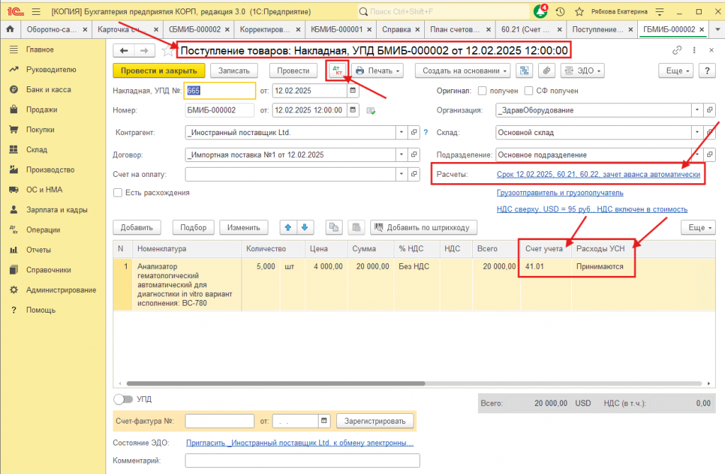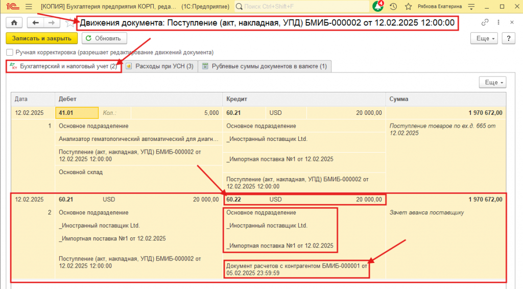 Далее, после того, как в программу будет корректно внесен документ «Поступление товаров: Накладная, УПД», при проведении будут Автоматически сформированы нужные проводки с хозяйственной операцией «Зачет авансов поставщику» - Дебет 60.21 «Расчеты с поставщиками и подрядчиками (в валюте)» Кредит 60.22 «Расчеты по авансам выданным (в валюте)» с корректной суммой зачета аванса в валюте Доллар США (USD) и в Российских рублях (руб.) (Рис. 13, 14).