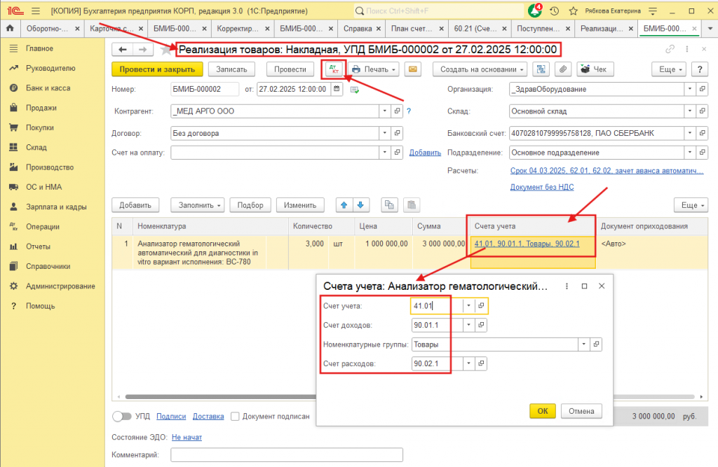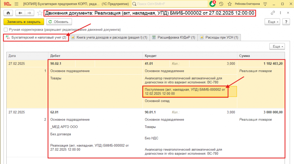 Далее, приобретенный товар был реализован клиенту. В программу внесен документ «Реализация товаров: Накладная, УПД», при проведении были сформированы корректные проводки, связанные с реализацией товаров с привязкой к конкретной партии (Рис.17, 18).