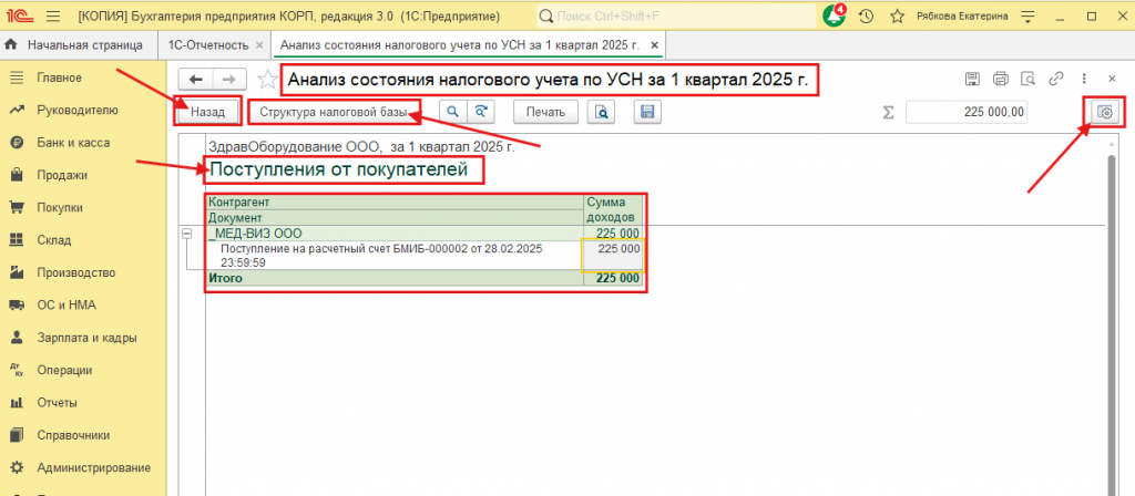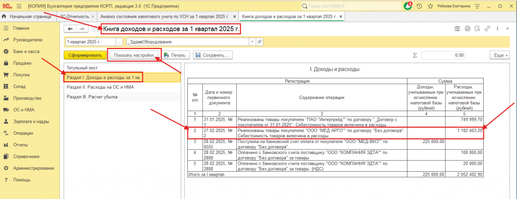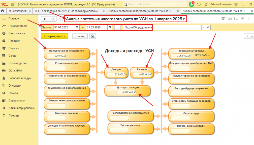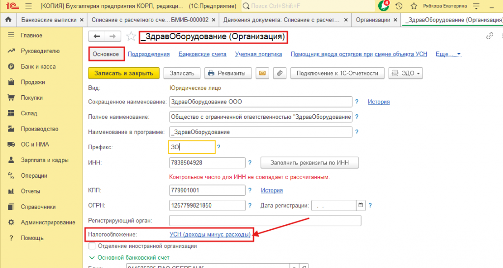 В нижеописанном примере, используются демонстрационные данные Компании – ООО «ЗдравОборудование», которая применяет «Упрощенную систему налогообложения» с объектом налогообложения «Доходы, уменьшенные на величину расходов» (Рис.1).