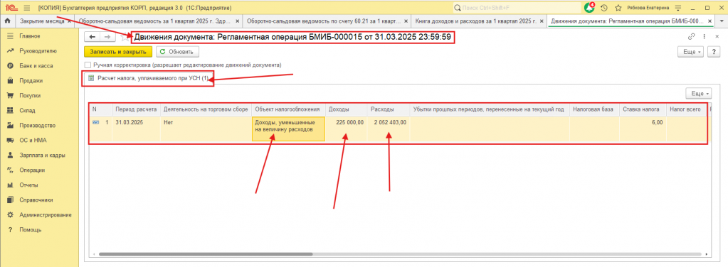 Далее, так как в примере все операции были проведены в первом квартале 2025 года необходимо провести операции «Закрытие месяца» за первый квартал 2025 года и проверить корректность регламентной операции «Расчет налога УСН» (Рис.29).