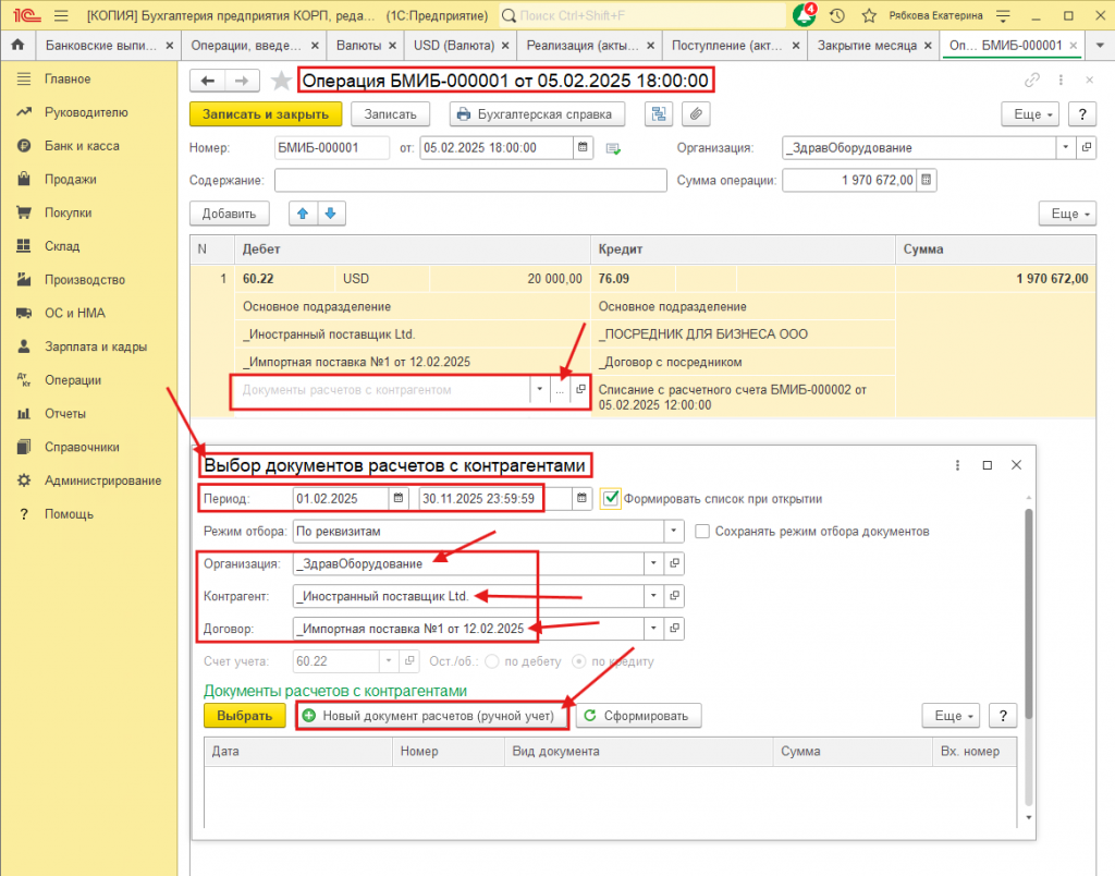 Далее, созданный и корректно заполненный «Документ расчетов с контрагентом» необходимо выбрать в качестве субконто в документе «Операция» (Рис.11, 12).