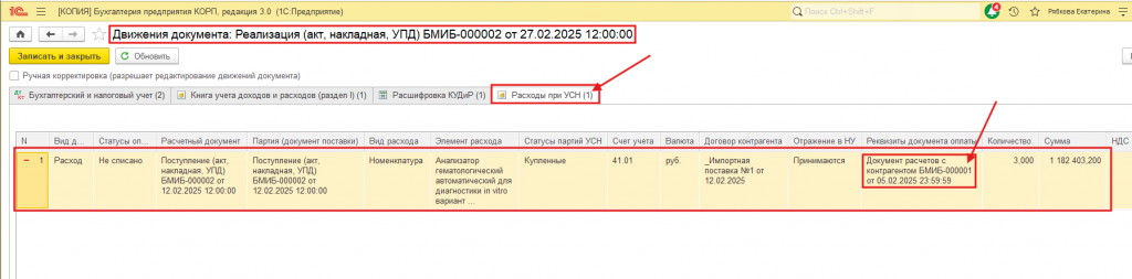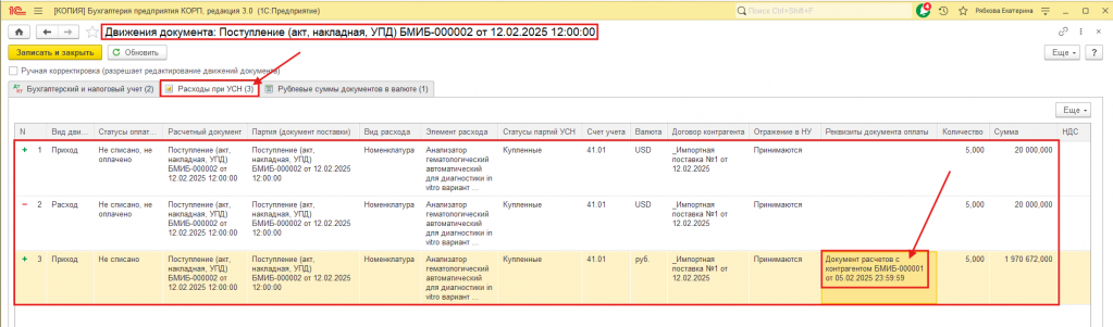 Так же, после проведения документа «Поступление товаров: Накладная, УПД», будут сформированы корректные записи по регистру накопления «Расходы при УСН», которые в дальнейшем повлияют на включение в принимаемые к налоговому учету расходы, связанные с оплатой товаров Иностранному поставщику (Рис.15).