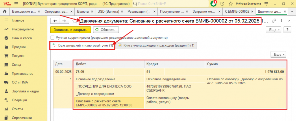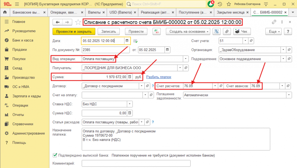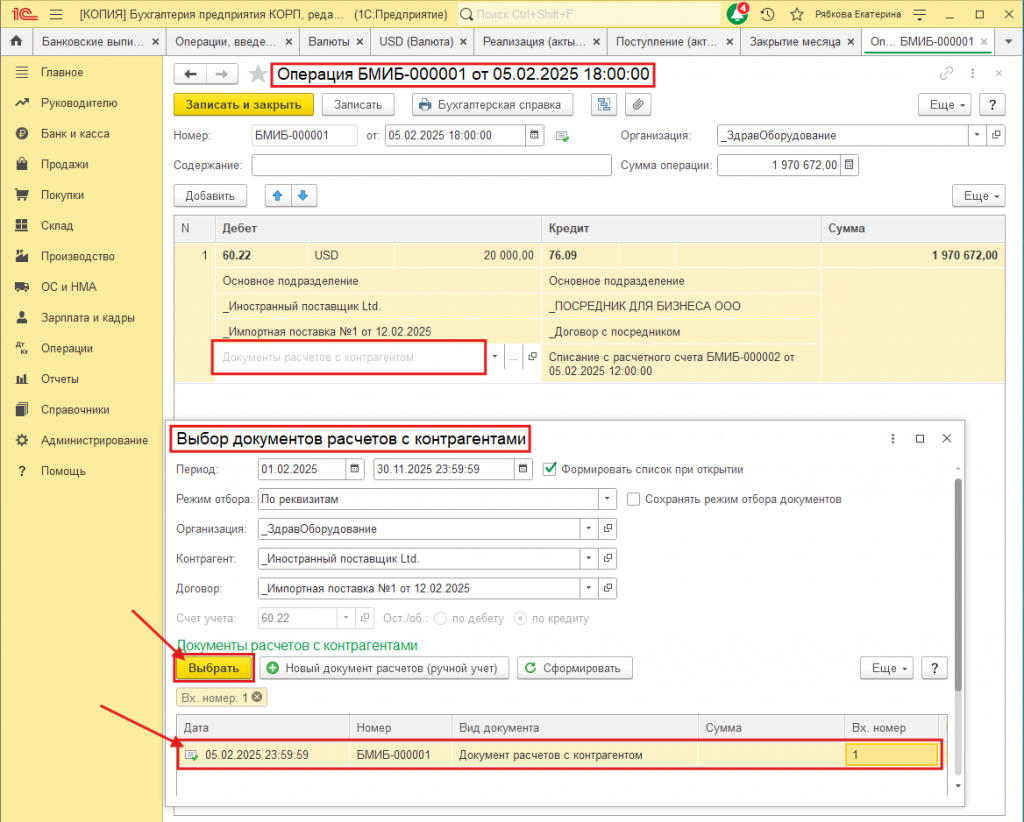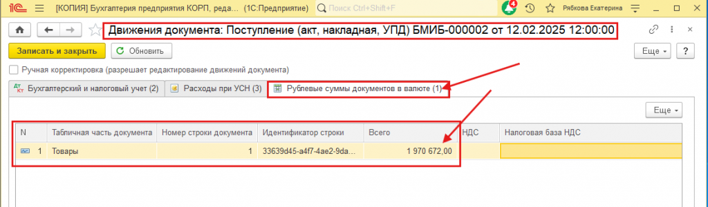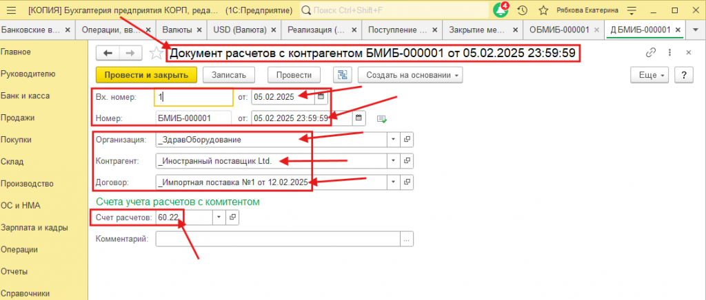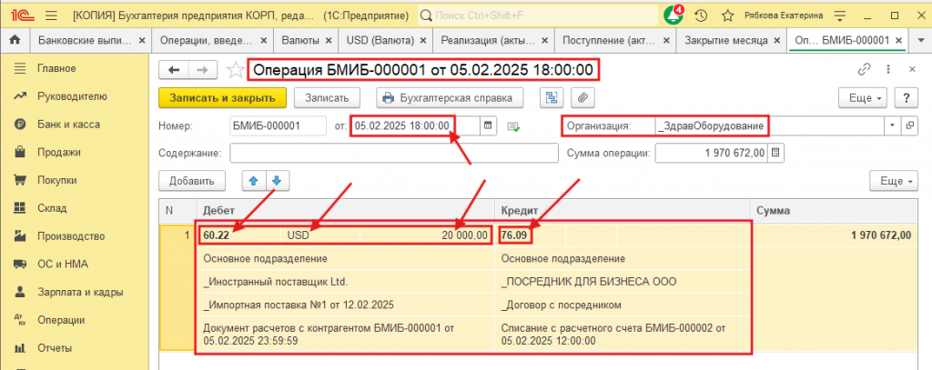 ВАЖНО! Если, по факту, в договоре поставки будет прописан курс валюты отличный от курса Центрального банка РФ на дату совершения хозяйственной операции, то в этом случае нужно будет вручную скорректировать сумму в валюте и в рублях в документе «Операция».