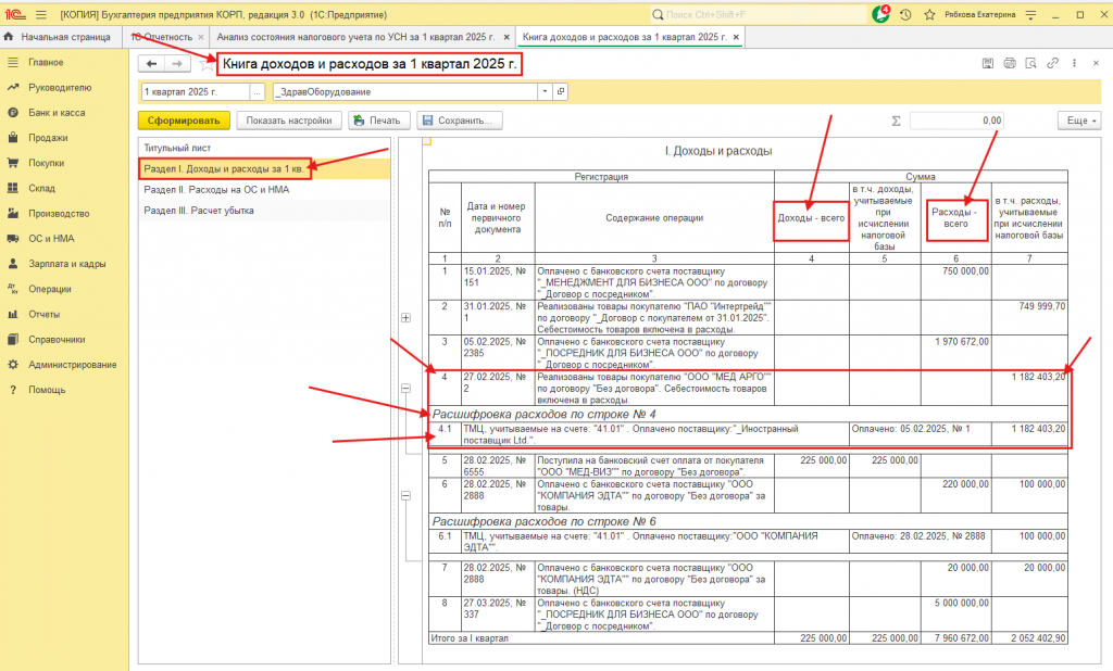 Также после проведения документа «Реализация товаров: Накладная, УПД» будут сформированы корректные записи по регистрам накопления «Книга учета доходов и расходов (раздел I)», «Расходы при УСН», и регистру сведений «Расшифровка КУДиР», все эти записи влияют на корректное включение в принимаемые к налоговому учету расходы на оплату товаров Иностранному поставщику и их отражение в регламентированном отчете «Книга доходов и расходов» (Рис. 19, 20, 21).