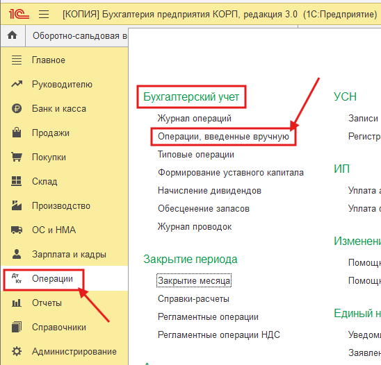 Так как Агенты, на практике, в основном, работают по предоплате с иностранными поставщиками, в этом случае возникает необходимость провести зачет аванса иностранному поставщику, сделать это возможно только документом «Операция», который находится в разделе «Операции» - «Бухгалтерский учет» - «Операции, введенные вручную» (Рис.7).
