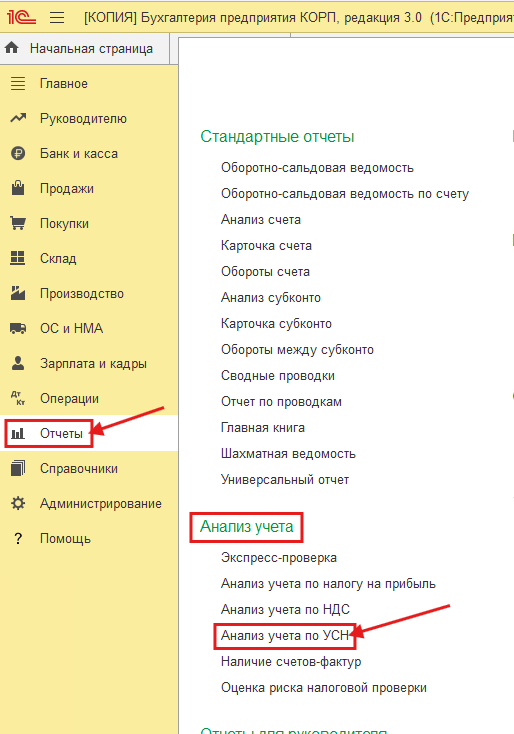 Так же для анализа данных можно воспользоваться отчетом «Анализ налогового учета по УСН», который находится в разделе «Отчеты» - «Анализ учета» - «Анализ учета по УСН» (Рис.26).