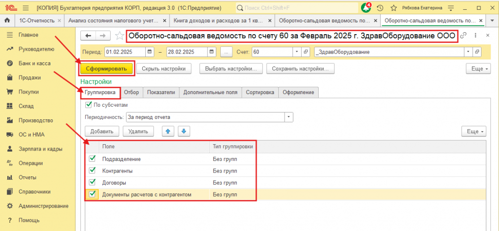 Также для контроля корректности внесенных в программу хозяйственных операций, нужно проверить данные с помощью отчета «Оборотно - сальдовая ведомость» по счету 60 «Расчеты с поставщиками и подрядчиками» и субсчету 76.09 «Прочие расчеты с разными дебиторами и кредиторами», при этом в настройках отчета должны быть включены все доступные «Группировки». Если все хозяйственные операции были внесены в программу корректно, то обороты по субсчетам 60.21, 60.22 и 76.09 будут полностью закрыты (Рис.31, 32, 33).