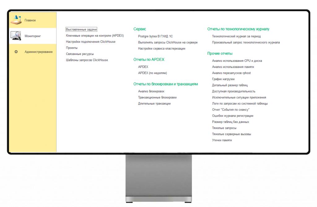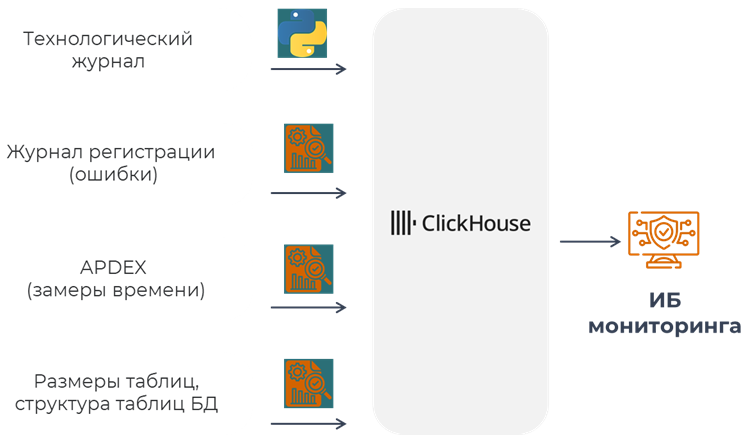 Система мониторинга состоит из нескольких подсистем. Первая – парсер технологического журнала на скриптах на Python плюс дополнительные обработки в каждой информационной базе для сбора дополнительной информации: Apdex, структура таблиц, ошибки журнала регистрации. Все это сливается в ClickHouse, и есть специальная информационная база мониторинга, где мы смотрим результаты того, что туда загрузили.