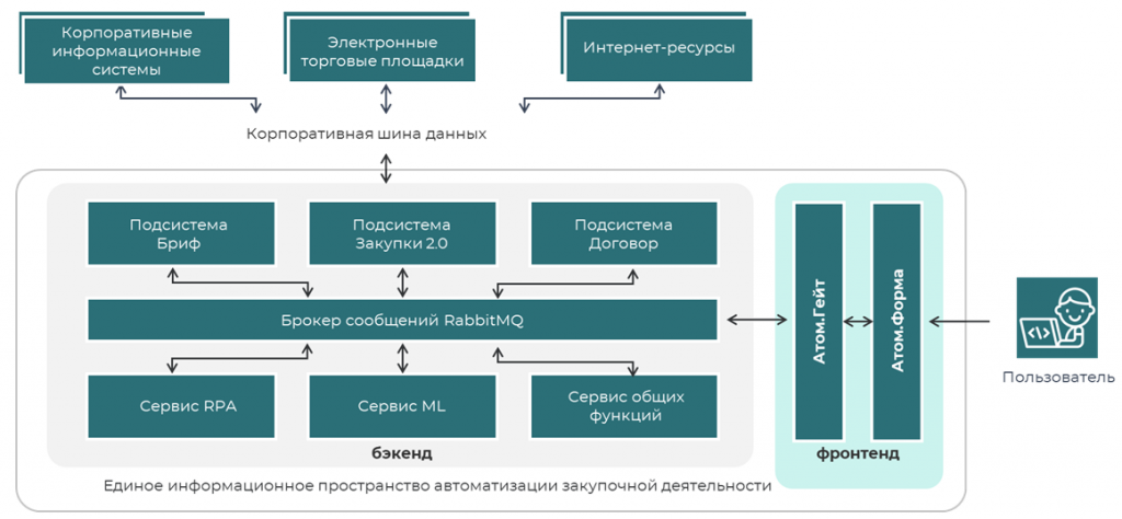 Так выглядит наше единое информационное пространство для закупочной деятельности. С точки зрения пользователя это один портал, но на самом деле пользователь авторизуется во множестве бэкендов, которые являются информационными базами 1С.