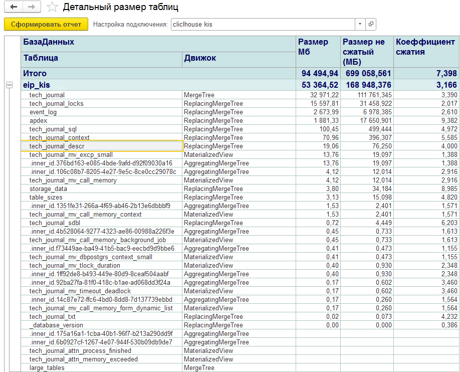 Ошибки журнала регистрации тоже нужно мониторить: они имеют свойство прирастать, особенно с релизами. Сейчас это актуально для наших проектов. Благодаря ClickHouse эти отчеты формируются быстро. Данные компактно хранятся за счет колоночного хранения и быстро отрабатывают.