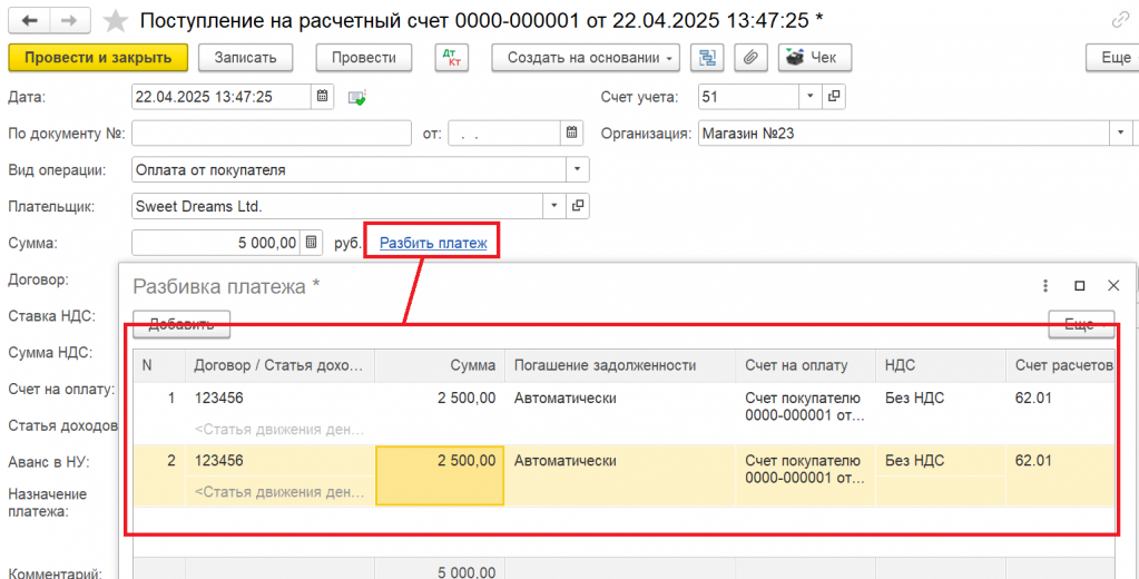 1. В документе - Поступление на расчетный счет нажмите на строку «Разбить платеж».