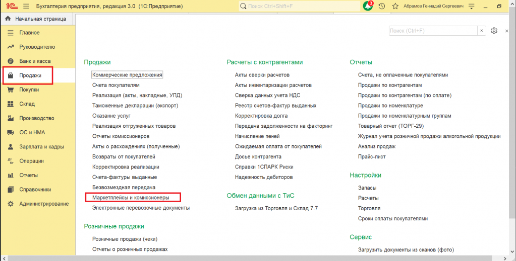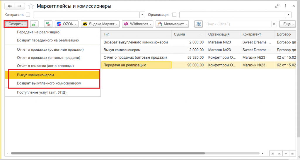 Из-за большого количества различных видов операций комиссионной торговли в 1С все добавленные предыдущими действиями документы и операции будут добавлены в разделе «Продажи» вкладка «Маркетплейсы и комиссионеры».
